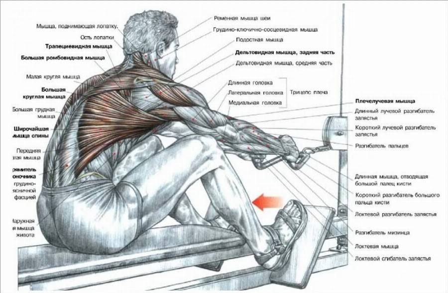 - подтягивайте рукоять к себе не за счет рук, а за счет широчайших, вследствие изолированного отведения локтей назад и сжатия лопаток;