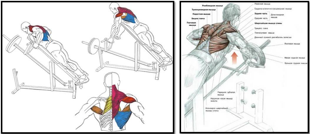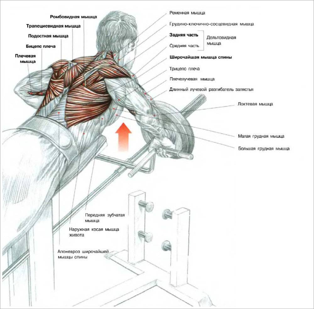В определенном участке движения нагрузку получают бицепсы рук, трапециевидные и ромбовидная мышца.