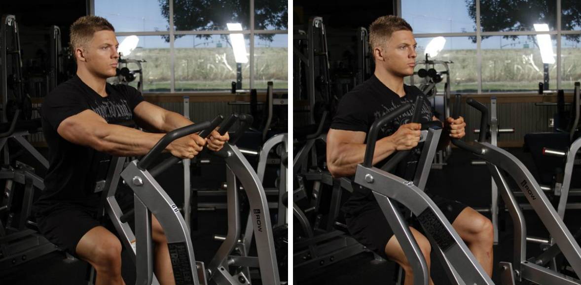 Важной особенностью этого упражнения является то, что при подтягивании рычагов к телу в работу включаются бицепсы. Нагрузка на широчайшие зависит, в том числе и от того, к поясу или к груди вы тянете ручки тренажера