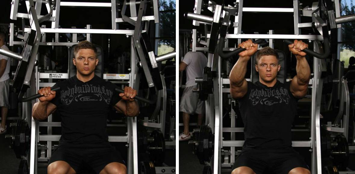 1. Жим в Хаммере сидя. Классический вариант тренировки — это жим от груди сидя, который чаще всего является дополнением к полноценной нагрузке при неравномерной прокачке грудных мышц. Вместе с целевыми мышцами, в работу включаются плечи и трицепсы. Алгоритм действия тренировки при этом будет следующим: