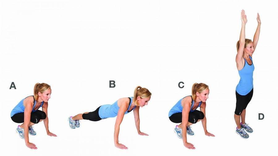 Упритесь руками в пол и выбросьте одновременно две ноги назад, чтобы оказаться в упоре лёжа. Затем в прыжке снова подтяните ноги к рукам и прыгните вверх, отрывая ступни от пола.