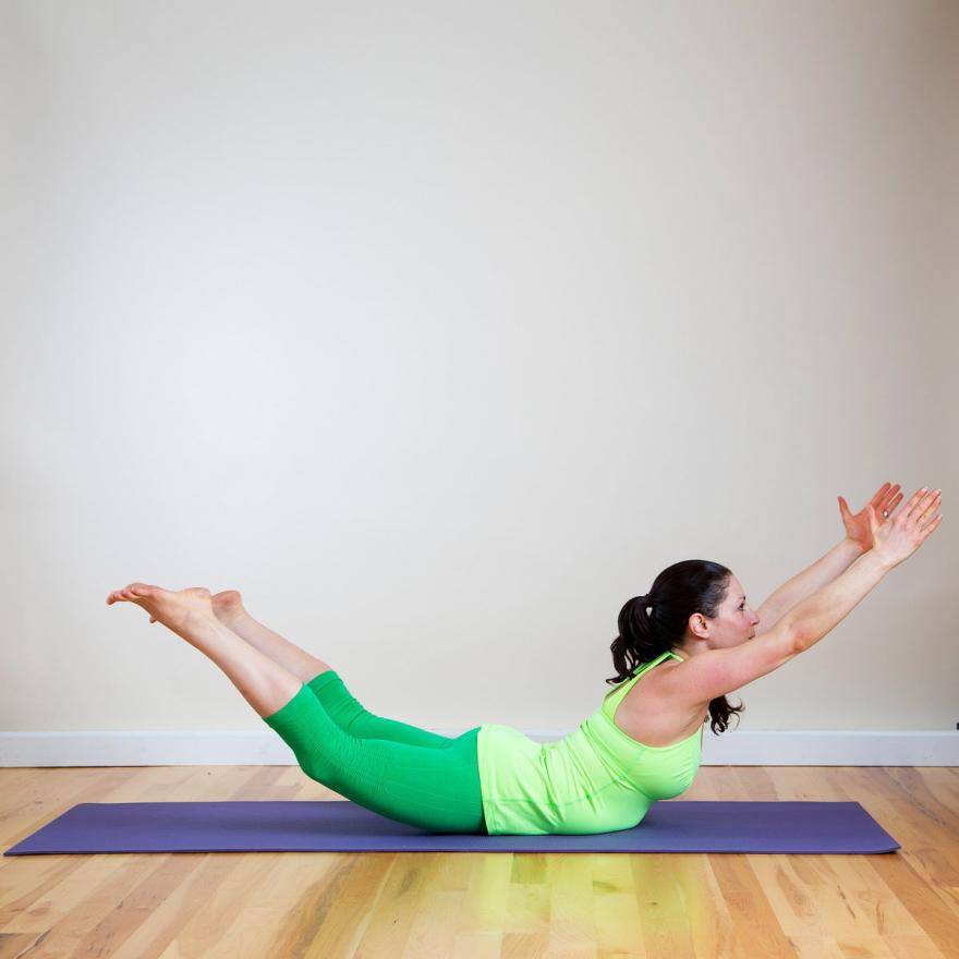 - Следующее упражнение для мышц спины тоже очень простое. Его называют «гибкая спина». Для его выполнения также нужно оставаться лежать на животе. Руки вытянуть прямо. Голова всё время должна быть опущена и смотреть вниз. Нужно на вдохе поднять руки параллельно полу, стараясь поднять грудь и плечи. Ноги отрывать от пола нельзя.