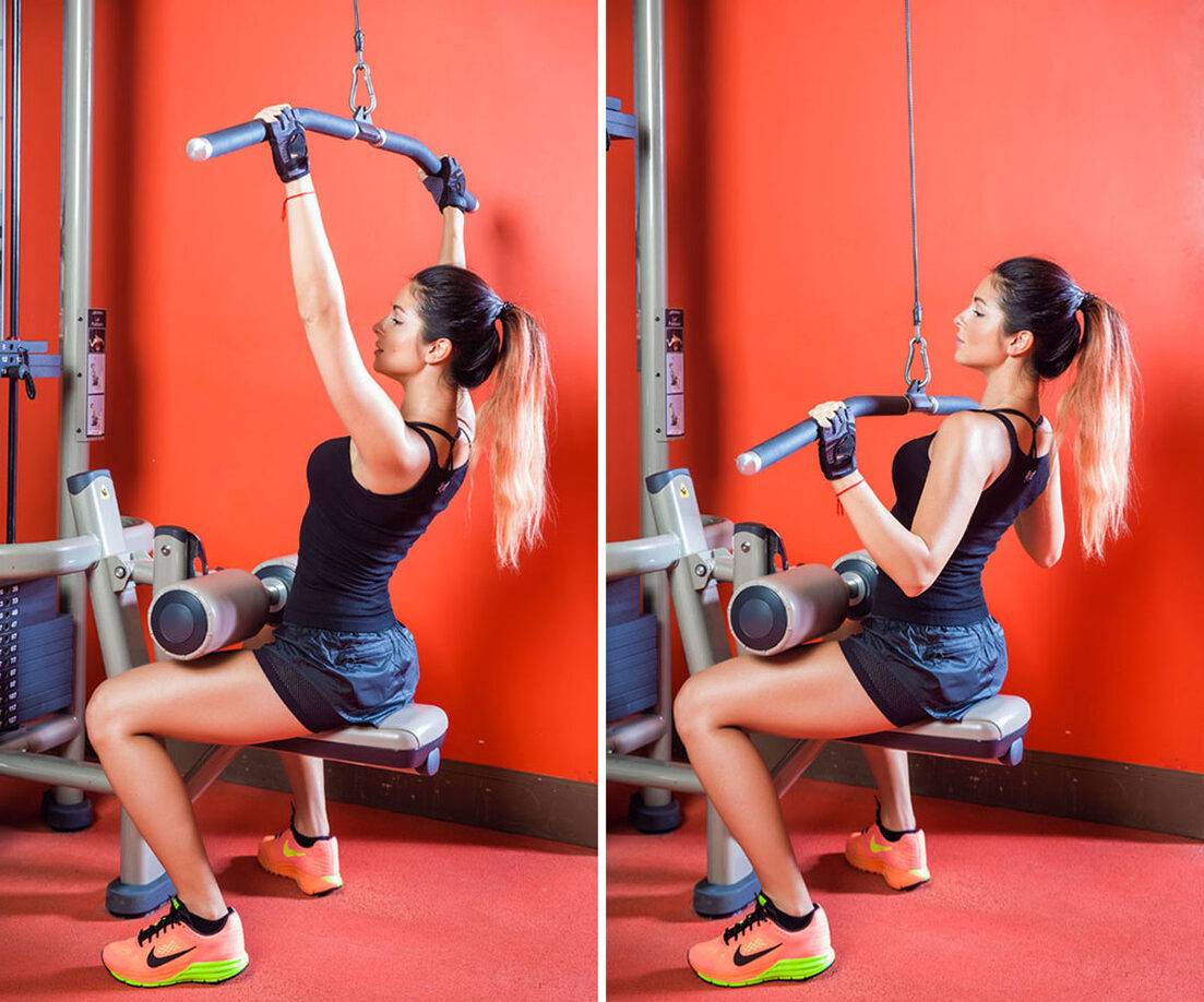 Совершают тягу широким хватом, включающую вертикальный блок. Движение, направленное к груди и назад за голову. Спина держится прямо.