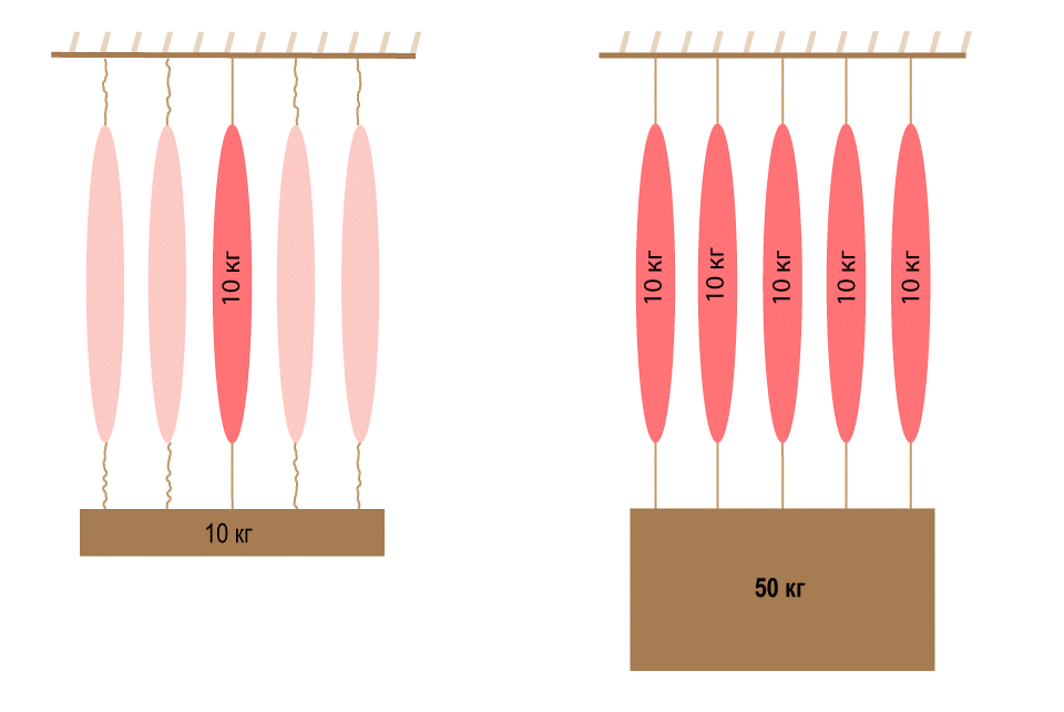 Посмотрите на мою схему ниже. Например, одно мышечное волокно способно создать нагрузку в 10 условных «килограммов». Допустим, в мышце пять мышечных волокон. Если нужно преодолеть нагрузку в 10 «килограммов», в работе будет одно мышечное волокно, испытывая, соответственно, предельную для него нагрузку (10 «килограммов»). Если придется преодолеть нагрузку в 50 «килограммов», в работу вступят все пять мышечных волокон, каждое из которых будет подвергаться нагрузке в те же 10 «килограммов».