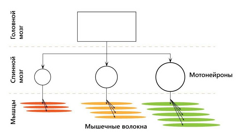 ДЕ отличаются друг от друга чувствительностью к сигналам. Сигналы из коры всегда идут ко всем мотонейронам, но в зависимости от того, какое усилие нужно создать, их величина меняется так, чтобы рекрутировалось необходимое количество ДЕ. Если небольшое – рекрутируются самые чувствительные, низкопороговые мотонейроны, нужно побольше – импульс усиливается, и вовлекаются дополнительные ДЕ, нужно еще большее усилие – еще больше импульс, максимальное количество ДЕ.