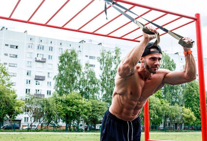 - выполняйте упражнения на ремнях на отжимание. Станьте спиной к петле и лицом к полу, руки вставьте в кольца и отжимайтесь не менее 20 раз;