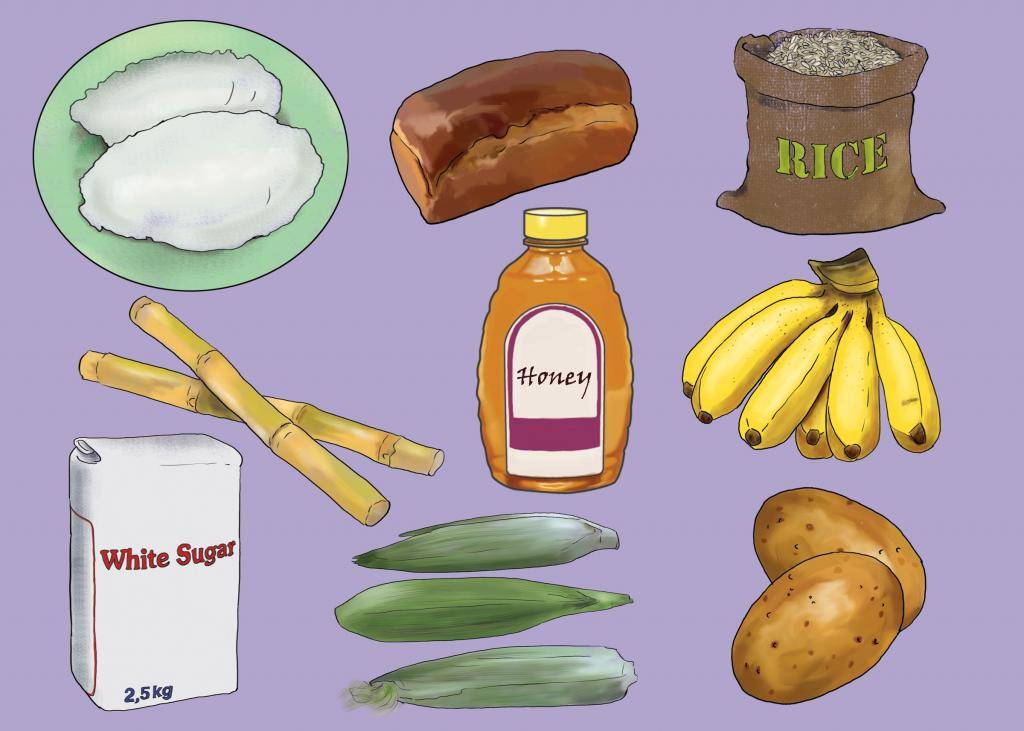 Почти вся еда имеет определенное количество данного макроэлемента, исключая мясо (даже моллюсков), которое является источником белка. Хотя после термической обработки оно получает некоторую долю углеводов, если дополняется приправами, соусами и т.д. То же относится к салу, растительным маслам, но здесь превалируют жиры. Лишены этого макроэлемента и твердые сыры (Пармезан, Грюйер и т.д.).