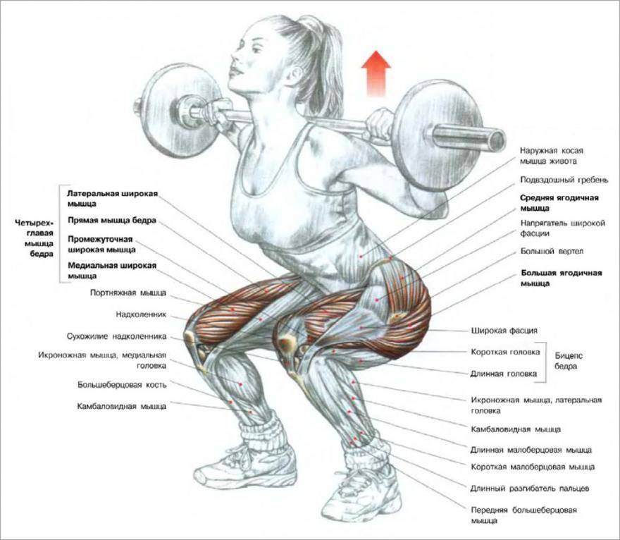 Некоторые базовые упражнения на ноги (в первую очередь приседания со штангой на плечах) дополнительно включают в работу поясницу, пресс и ягодицы.