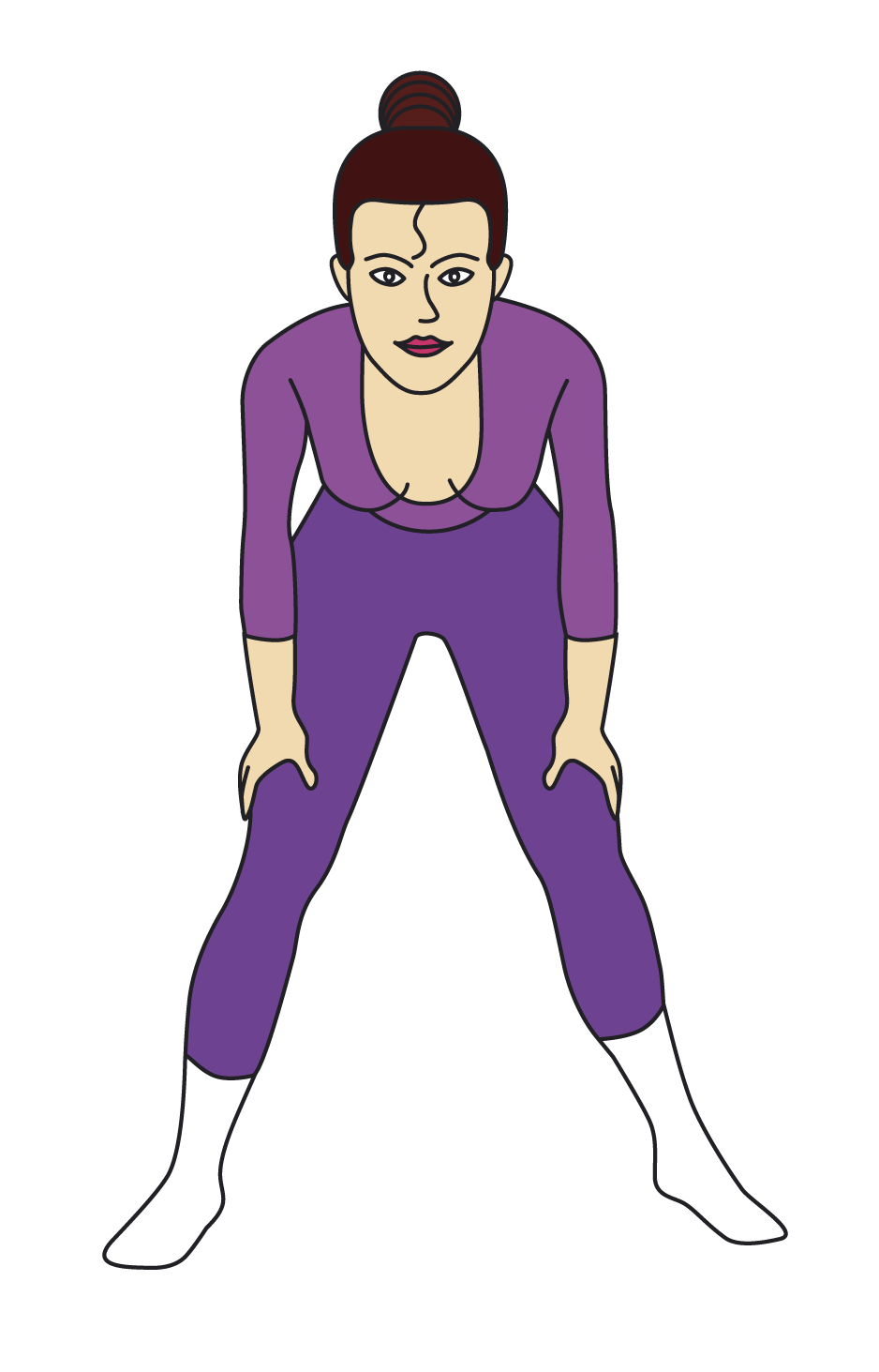 Исходное положение: ноги в стороны, руки опираются на колени, мышцы тазового дна напряжены. Спину следует держать прямо и напрягать мышцы тазового дна по направлению вверх и вовнутрь.