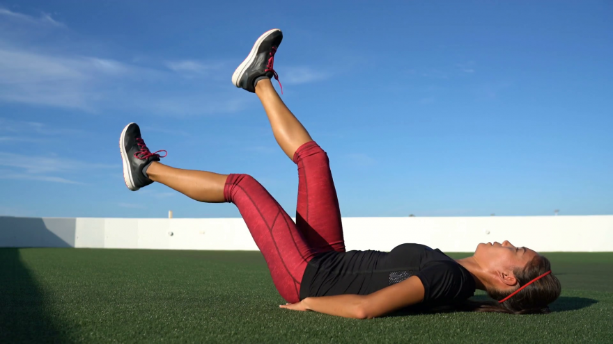 - Поднимите чуть согнутые ноги или колени выше горизонтали, подкручивая таз вверх.