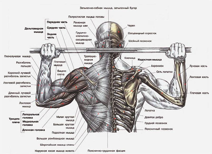 При выполнении комплекса на перекладине в работу включаются множество мышц, что делает данный вид тренировок очень эффективными. Выполнение подтягиваний или иных упражнении на турнике заставляет работать следующие группы мышц: