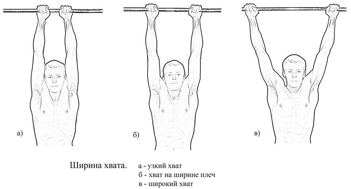 Комбинировать нагрузку на разные группы мышц можно не только способом постановки рук на перекладине, но и изменением хвата по ширине. Для подтягиваний используется три варианта хвата: средний, когда руки находятся примерно на ширине плеч, широкий и узкий, когда кисти рук расположены близко друг к другу. Чередование ширины прямого или обратного способа захвата позволяет разнообразить тренировки, задействовать максимальное количество мышц.
