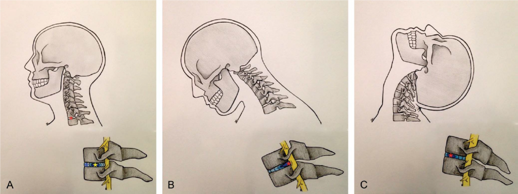 Рис. 1. А) Вид сбоку шейного отдела позвоночника в нейтральном положении, показывающий красный межпозвонковый диск, синее фиброзное кольцо и жёлтое пульпозное ядро; В) Вид сбоку шейного отдела позвоночника, показывающий миграцию назад красного пульпозного ядра при сгибании; С) Вид сбоку шейного отдела позвоночного столба, показывающий миграцию вперёд красного пульпозного ядра при разгибании.