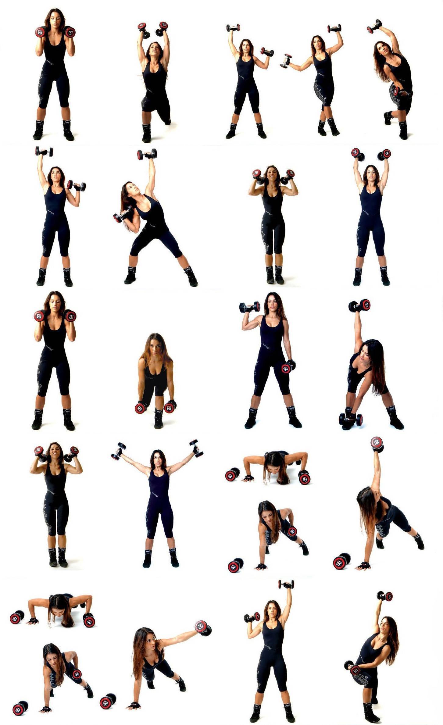 Само по себе содержание упражнений вторично, так как целью каждого из них является, прежде всего, повышение ЧСС и максимальный расход энергии, и лишь во вторую очередь нагрузка на определённые группы мышц. Именно поэтому мы предлагаем вам лишь набор упражнений с гантелями для девушек, который вы сами можете распределить по тренировочным дням и кругам в зависимости от ваших индивидуальных особенностей и предпочтений. Все упражнения для женщин с гантелями состоят из выпрямлений рук и ног, маховых и шаговых движений в тех или иных комбинациях, а также скручиваний туловища. Во время тренировки пейте достаточное количество воды, не отдыхайте больше одной-двух минут между подходами и экспериментируйте с комбинациями упражнений, меняя их сочетания в кругах и тренировочных днях.
