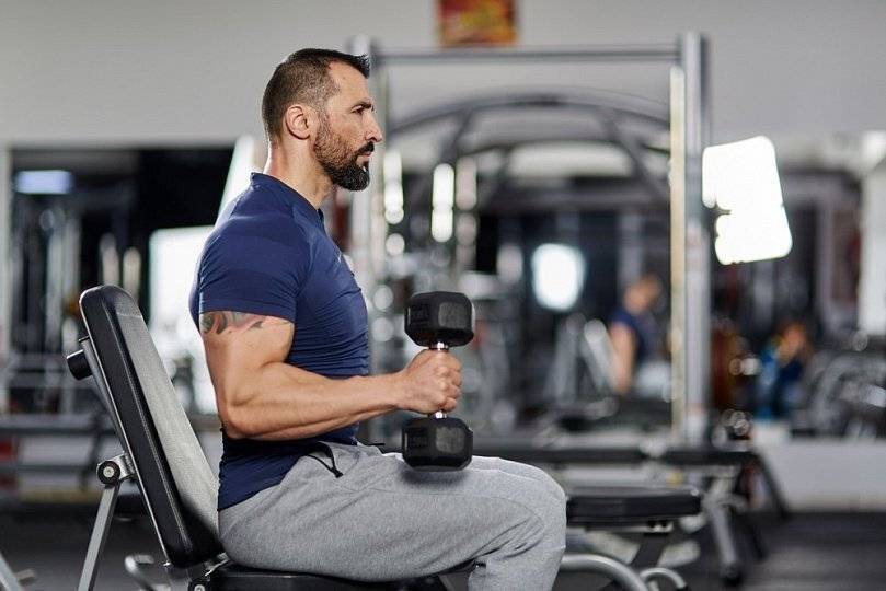 Здесь важно правильно отрегулировать высоту пюпитра. В этот постамент спортсмен упирается локтями, сидя на сиденье. Ладони с гантелями разворачиваются к друг другу