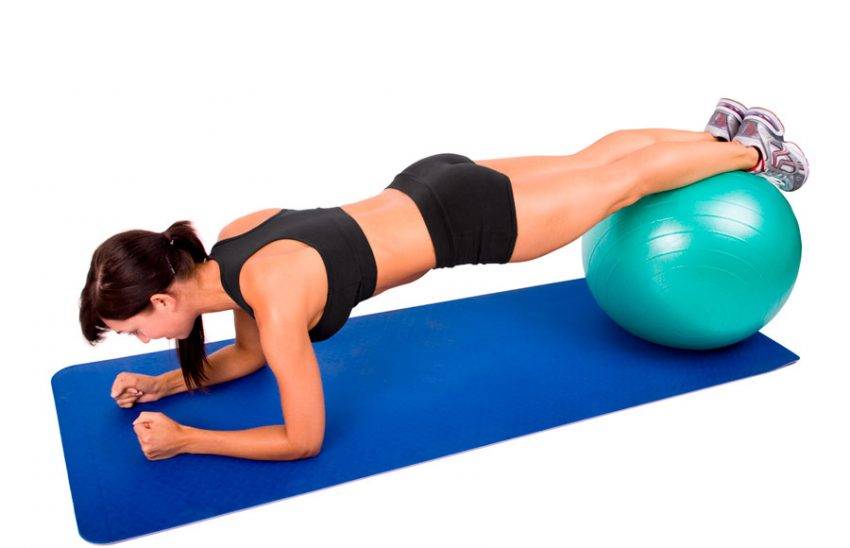 Для этого упражнения понадобится скамейка. Ноги разместить на скамейке, предплечья – на мяче. При правильном выполнении стойки корпус образовывает прямую линию от плеч до лодыжек. Удерживать тело в этой стойке в течение минуты.