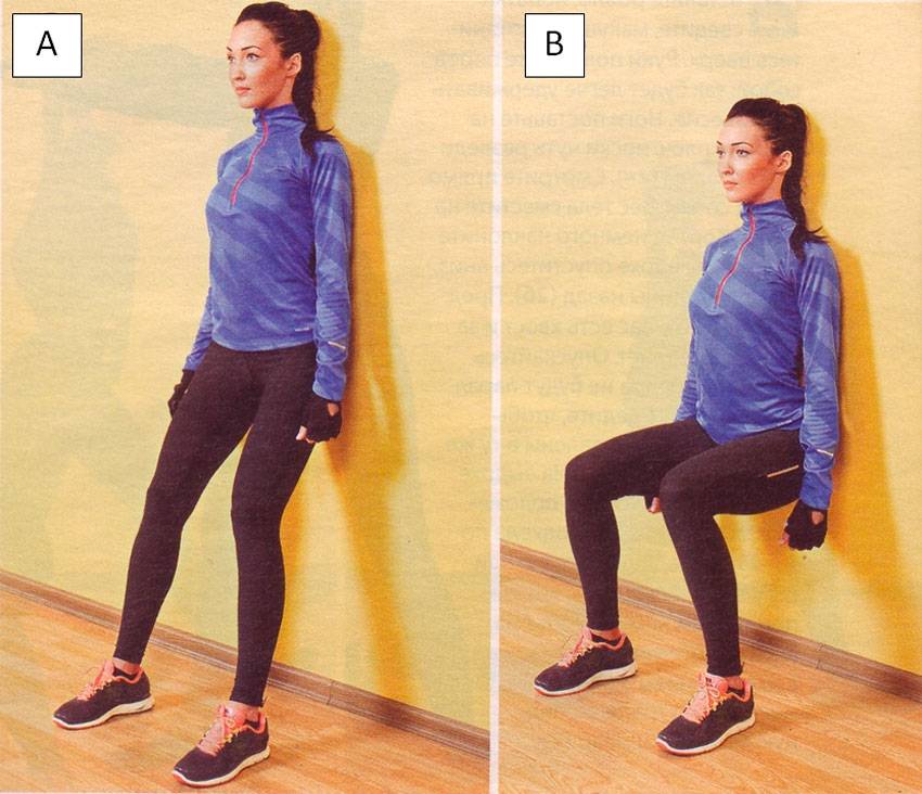 Упражнение «Стульчик» тренирует мышцы бёдер и ягодиц, укрепляет колени, связки и сухожилия