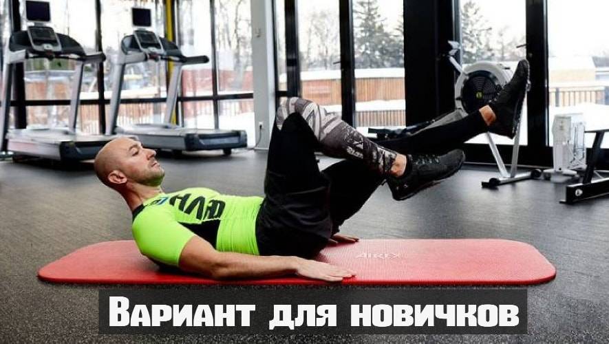 Так как классический вариант с вращениями, может быть очень сложен для начинающих атлетов. Существует более легкая версия данного упражнения. Где в работе задействованы только ноги. Для лучшей стабилизации туловища, можно за что нибудь ухватиться руками. При выполнении упражнения, большая часть нагрузки сместится на нижние отделы прямой мышцы живота. Также, активное участие примут ягодичные и бицепс бедра. Косые же мышцы в данном варианте, не участвуют.