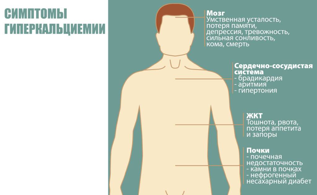 Однако и избыток кальция в продуктах не сулит ничего хорошего. В особенности риск гиперкальциемии велик при приёме высоких доз витамина D, который насильно принуждает кишечник усваивать кальций. Тем более опасно его сочетание с мегадозами кальция, что может стать причиной инсульта, инфаркта, почечнокаменной болезни. О лишнем кальции в крови сигнализируют такие симптомы, как тошнота, рвота, жажда, аритмия, депрессия, ухудшение работы мозга, мышечно-суставная боль, гипертензия и др.