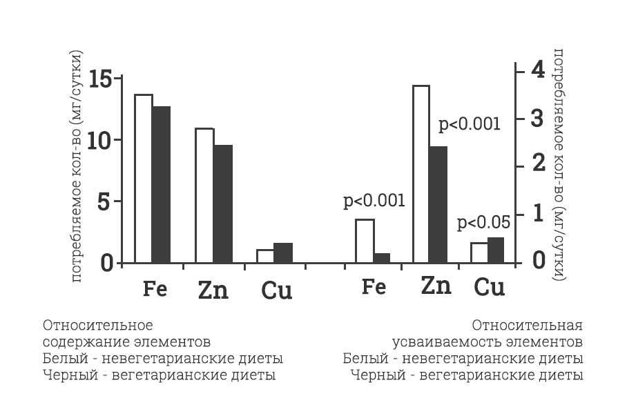 Например, в “Американском журнале клинического питания”опубликованы результаты исследований, сколько усваивалось железа, цинка и меди при вегетарианских и невегетарианских диетах. При примерно сопоставимом содержании этих элементов, из растительной пищи они усваиваются хуже.