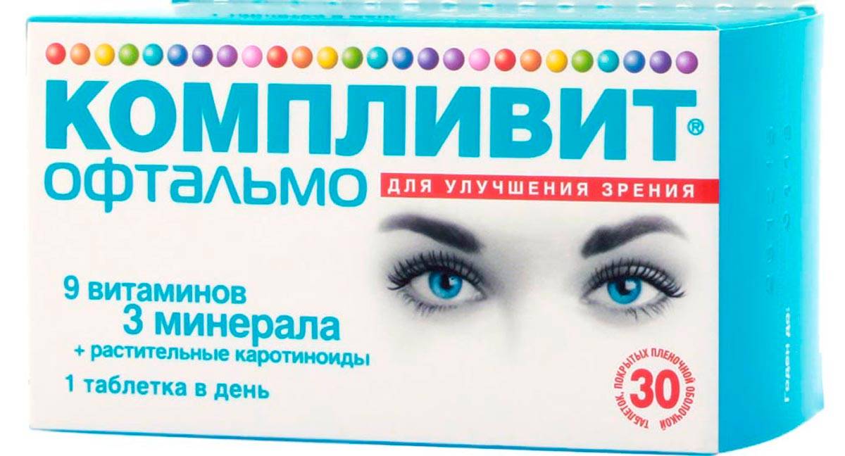 Оказывает положительный эффект на все функции зрительных органов такой препарат, как «Компливит офтальмо». Он направлен на улучшение остроты зрения, защищает от негативного излучения смартфонов и телефонов, укрепляет сосуды глаз. Единственный недостаток данных витаминов заключается в том, что их не следует применять людям, не достигшим совершеннолетнего возраста.