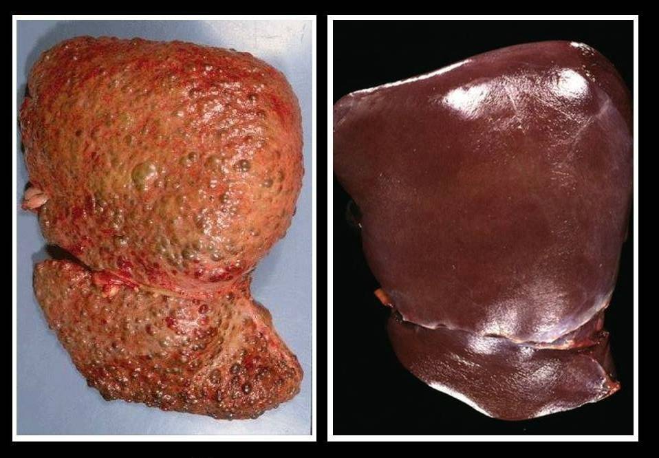 фото 1 – печень алкоголика 2 стадия; фото 2 – здоровая печень