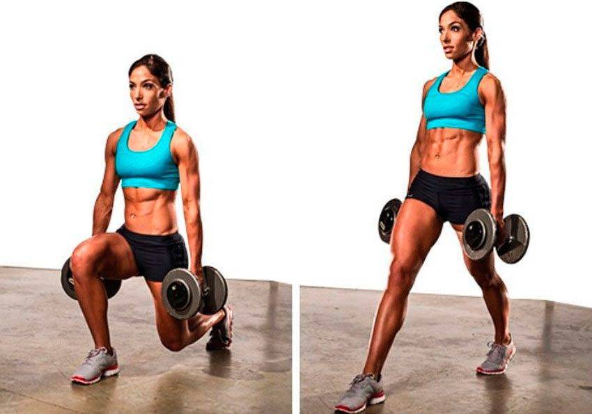 Боковые или выпады в сторону с гантелями в большей степени прорабатывают внутреннюю поверхность бедра. Также этот элемент отлично развивает равновесие и чувство баланса.