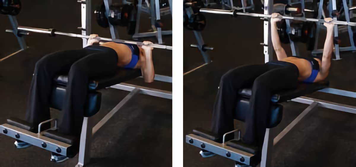 | Жим на наклоненной вниз скамье. 4 подхода, повторяем упражнение 12 раз в первом подходе, 10 во втором, 8 и 6 в третьем и четвертом. |  |
