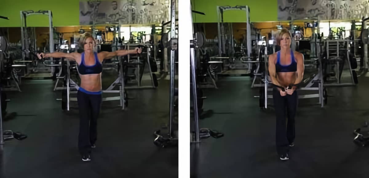 Чтобы максимизировать пиковое сокращение, остановите движение в положительной фазе повтора и сильно напрягите мышцы на 1-2 секунды, когда гантели или рукоятки троса будут находиться друг от друга на расстоянии 7-10 см.