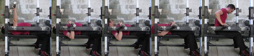 - Жим гантелей на наклонной скамье: 3 подхода из 4-6 повторений;