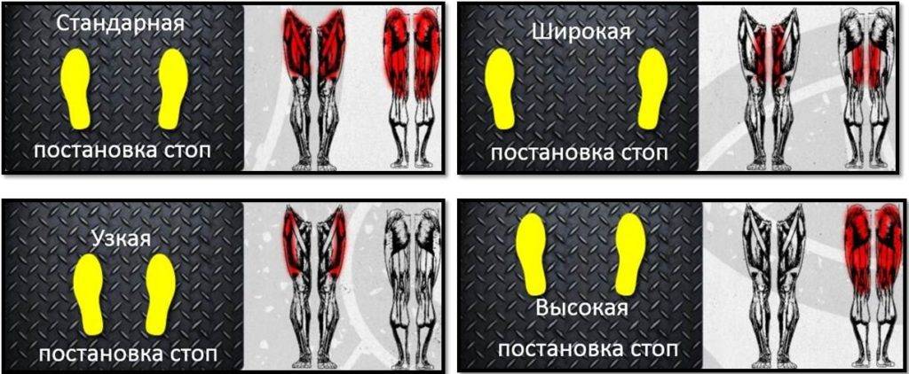 В зависимости от того, как расположить ноги на платформе, можно усилить нагрузку в тех или иных областях мышц ног. Существует несколько вариантов расположения ног. Среди таких: