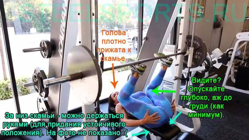 - Начинающим бодибилдерам жим штанги на наклонной скамье можно делать в тренажере Смита. Это более безопасно.