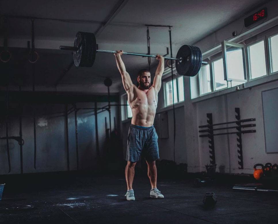 Это когда мы штангу поднимаем над головой. В верхней фазе когда мы уже проходим голову, активно начинают включаться трапецивидные мышцы. Этим упражнением мы грузим весь плечевой пояс.
