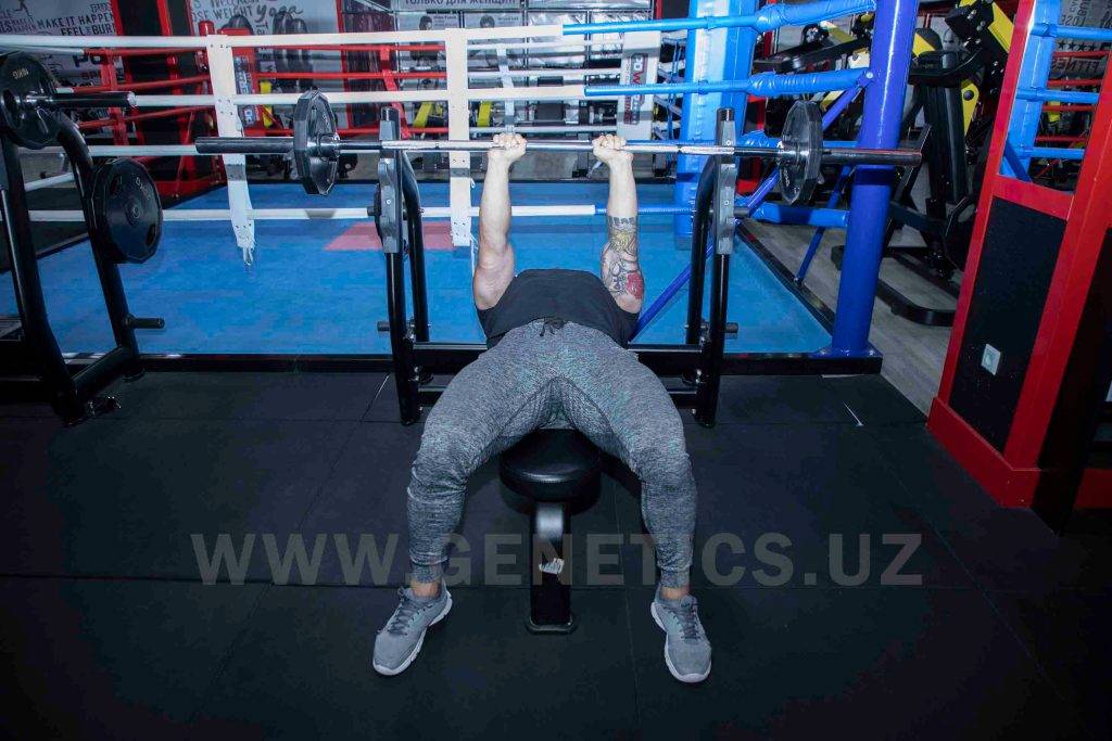 - Округлять спину или отрывать голову с плечевым поясом от поверхности скамьи. Если допустить подобное, практически вся нагрузка переляжет на плечи.