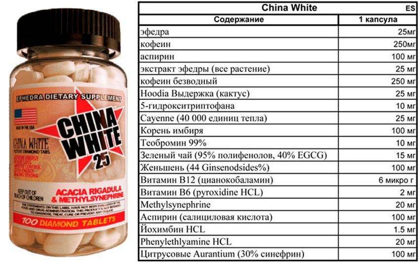 Несмотря на относительно небольшое количество эфедры, добавка необычайно популярна и имеет внушительный эффект. Он достигается за счет взаимодействия всех компонентов. Более того, главное преимущество China White заключается в том, что все компоненты в составе имеют натуральную основу. Это касается не только эфедры и коры Белой Ивы, но и каждого вещества в составе. Благодаря этому добавка не оказывает вредного воздействия на организм и позволяет эффективно бороться с лишним жиром.